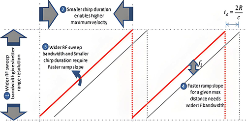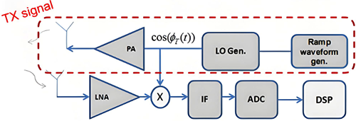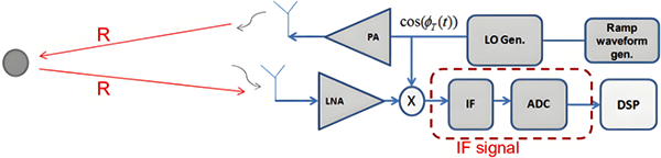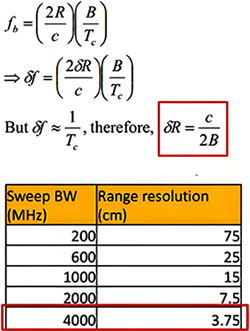 FMCW雷達(dá)的優(yōu)點(diǎn)在于具備掃描寬的RF(射頻)帶寬(GHZ)的同時(shí)還能夠保持小的IF(中頻、差頻或拍頻)帶寬(MHz)。FMCW雷達(dá)優(yōu)點(diǎn)還有具備高的距離分辨率(例如,在RF帶寬為2GHz時(shí)距離分辨率達(dá)到7.5cm,同時(shí)IF仍然可以保持在15MHz以下)。
