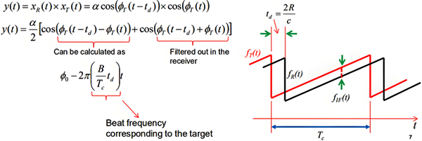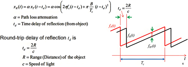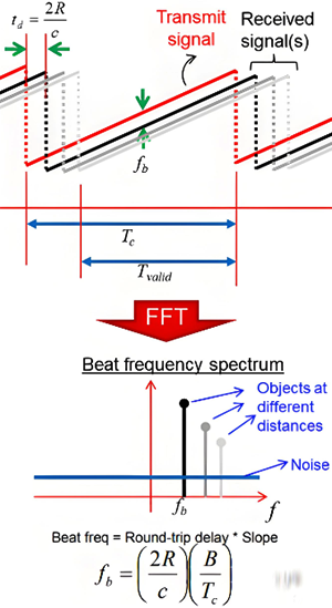 對于靜止目標(biāo),中頻僅與距離(回波的往返延遲)是成比例的。對于FMCW的中頻fb來說它等于調(diào)頻斜率(B/Tc)乘以往返時(shí)間td。對于多個(gè)目標(biāo),中頻信號是由多個(gè)目標(biāo)的對應(yīng)的多個(gè)中頻組成的,其中每個(gè)中頻與目標(biāo)的距離成比例關(guān)系,并且這些中頻對應(yīng)不同目標(biāo)的距離。物體檢測和距離(范圍)估計(jì)通常是通過對接收的中頻信號做FFT得到的。