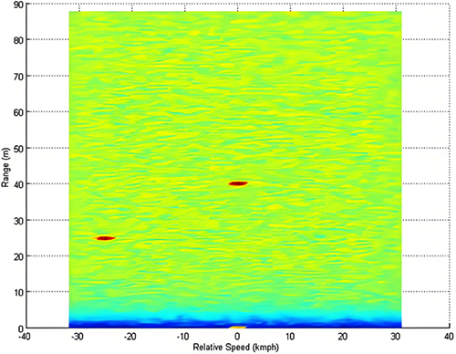 從1可以看出chirp之間的相位變化僅取決于速度(與距離無關(guān)),之后經(jīng)過對chirp進(jìn)行2D-FFT處理之后,來確定相位變化,從而來確定速度。二維FFT的過程給出了距離速度圖像,如圖所示。