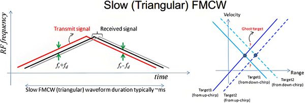 在許多傳統(tǒng)的系統(tǒng)中經(jīng)常使用慢速FMCW波形,也就是所說的三角波,調(diào)頻持續(xù)時(shí)間為毫秒級而不是微秒級。慢速FMCW的優(yōu)點(diǎn)在于對DSP MIPS要求低,不用進(jìn)行2DFFT處理。但是存在模糊的問題,并且沒有好的方法可以獲取距離-多普勒圖,對于探測范圍和多普勒效應(yīng)的討論也和鋸齒波相類似。