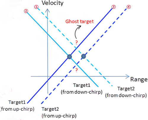 可以看出兩個(gè)幽靈目標(biāo)其實(shí)是下圖中目標(biāo)1(上升chirp圖中的③)與目標(biāo)2(下降chirp圖中的①)以及目標(biāo)1(下降chirp圖中②)與目標(biāo)2(上升chirp圖中的④)。是由不同目標(biāo)的上升chirp與下降chirp交織導(dǎo)致的。