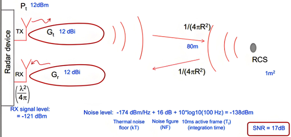 雷達(dá)收發(fā)電磁波的物理模型如下圖所示,其中要確定發(fā)射功率Pt=12dBm,也就是說Pt=12dBm-30dB=-18dB(這個(gè)地方是dBm編變成了dB)。Gt=Gr=12dBi,Rmax=80m,SNR=17dB,RCS=1m^2,噪聲系數(shù)NF=16dB。