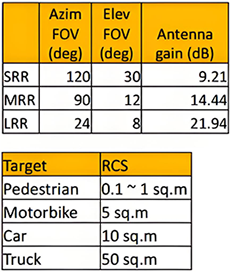 SRR、MRR、LRR其對應(yīng)的水平FOV俯仰FOV,以及天線增益在下表中給出。同時(shí)列出了幾個(gè)目標(biāo)的RCS。
