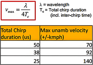 在快速調(diào)頻連續(xù)波(FMCW)調(diào)制中的最大無模糊速度取決于線性調(diào)制周期-更高的速度需要更陡的斜坡。最大速度的公式如下,λ是波長,Tc是chirp持續(xù)時(shí)間(包含chirp間時(shí)間):