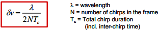 N為一幀中chirp的數(shù)量,Tc上面也提到過是chirp周期(包含幀間時(shí)間)。由因?yàn)閹芷?N*Tc。那么速度分辨率主要取決于誰就能一眼看出來(速度分辨率與幀時(shí)間成反比)。