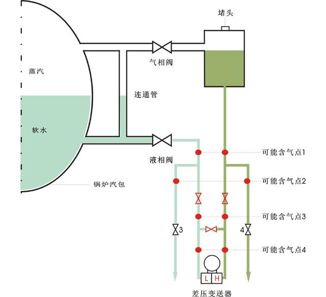 經(jīng)過認真分析,認為第一步的分析可能有誤。當(dāng)時噴射的大量濕氣體可能就是含有空氣的氣體。那么,為什么負壓側(cè)也能放出濕氣體呢?為了分析清楚原因,我們畫出了汽包水位測量的原理圖,如圖1所示。