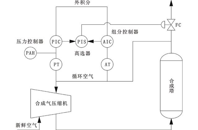 某合成氨廠節(jié)能控制系統(tǒng)中合成馳放氣自動(dòng)控制系統(tǒng)在投入自動(dòng)控制運(yùn)行中突然發(fā)生壓力高報(bào)警,該系統(tǒng)是合成系統(tǒng)壓力控制系統(tǒng)PIC和合成馳放氣氣體組分控制系統(tǒng)AIC組成的選擇性控制系統(tǒng)。