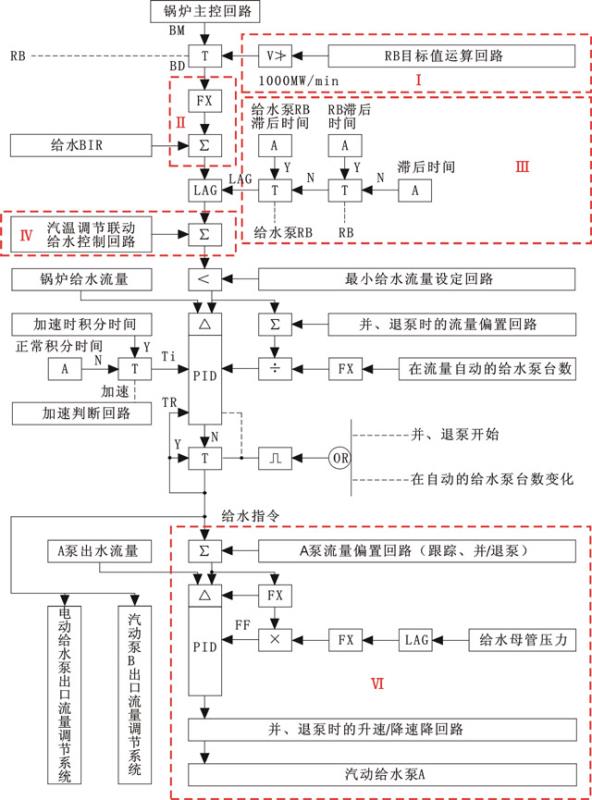 通常給水主控的輸出為各臺泵的轉(zhuǎn)速指令直接送到MEH系統(tǒng),這種設(shè)計(jì)少串了一個(gè)給水泵出口流量調(diào)節(jié)回路,結(jié)構(gòu)簡單。但由于各泵出水流量不相等,容易造成各臺泵出力不平衡,不利于全程自動(dòng)的實(shí)現(xiàn)。因此,各臺給水泵設(shè)計(jì)一個(gè)出口流量調(diào)節(jié)回路,如圖1中的Ⅵ部分所示。
