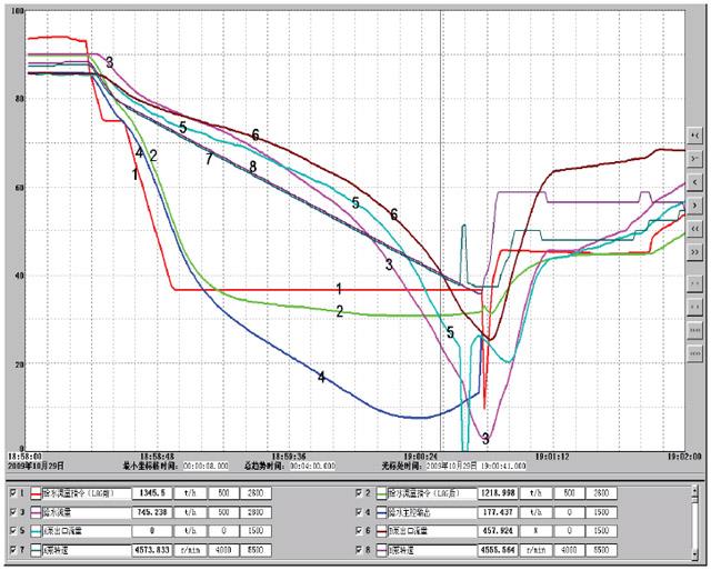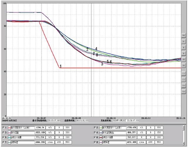 由于實(shí)際給水流量已經(jīng)瞬間減少了一半,協(xié)調(diào)給水與燃料特性的滯后時(shí)間LAG只需要穩(wěn)定運(yùn)行泵在最高轉(zhuǎn)速運(yùn)行即可,因此,LAG盡可能在大些,否則在給水指令的迅速下降過程中,由于前饋的作用,反而會降低給水泵的轉(zhuǎn)速。
