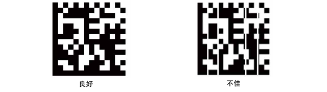 使用標(biāo)簽打印機時:標(biāo)簽打印機中的熱敏打印機常用于二維碼的打印。我們可以看到右側(cè)的DataMatrix碼(不佳)中有白色豎線顯示。這種現(xiàn)象叫做點缺失,通常是由于打印頭上有灰塵或打印頭老化導(dǎo)致。