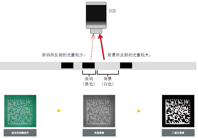 CCD是通過識別對比(黑與白)上的差異來對二維條碼進(jìn)行讀取,原理如下圖所示。DPM條碼的讀取一般比較困難,這是因為反射的光亮不僅卻決于條碼的顏色和背景,還跟材料、表面狀況、不規(guī)則等條件有關(guān)。