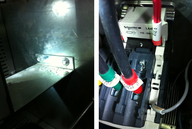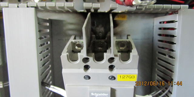2、與其他元器件不同,該斷路器的接線緊固螺釘是穿透式的,緊固完線鼻后,螺釘距金屬安裝底板的間距不足2cm,當大電流通過,散落在后面溝槽的鐵屑會被大電流吸引過去,從而導致瞬間的對地短路。