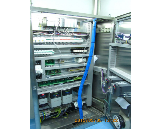 2、24V開(kāi)關(guān)電源,存在容量選擇偏小,總共10A(CPU,I/O,2塊稱重儀表,2個(gè)無(wú)紙記彩色錄儀,2個(gè)TP1200觸摸屏),出線太細(xì)(只有1mm2線徑),負(fù)荷重而傳輸距離遠(yuǎn),導(dǎo)致線阻大壓降大,導(dǎo)致控制柜間的壓差大,遠(yuǎn)端設(shè)備受干擾嚴(yán)重。