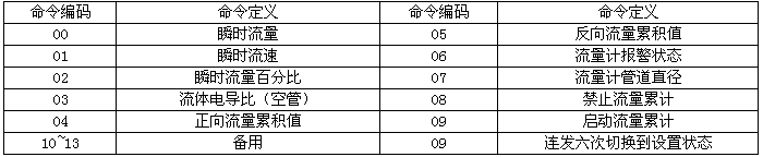 從機(jī)接到該命令后,立即停止流量累積,并回送命令認(rèn)可信息。停止流量累積延續(xù)時(shí)間為20秒,20秒后從機(jī)自動(dòng)恢復(fù)流量累積計(jì)算。因此,若想連續(xù)禁止流量累積計(jì)算,必須以小于20秒的間隔,向從機(jī)發(fā)送該命令。該功能可用于斷續(xù)過程計(jì)量。