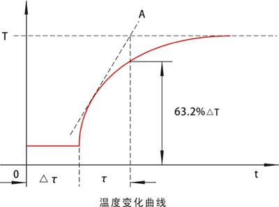 實踐證明熱電偶、熱電阻、雙金屬溫度計當(dāng)被測溫度突然發(fā)生變化時,其輸出會延遲一段時間,這段延遲時間△τ一般叫做純滯后或純時延。在延遲△τ后,會以近似于指數(shù)曲線的規(guī)律變化(如下圖所示),如忽略△τ,并以介質(zhì)溫度變化做計時起點,則上述曲線符合T=△T(1-e-t/τ),此式中T為溫度;△T為溫度變化;t為時間;τ為時間常數(shù)。時間常數(shù)就是反應(yīng)曲線起點的切線與平衡溫度交點A所對應(yīng)的時間,也就是輸出變化63.2%△T所需要的時間。
